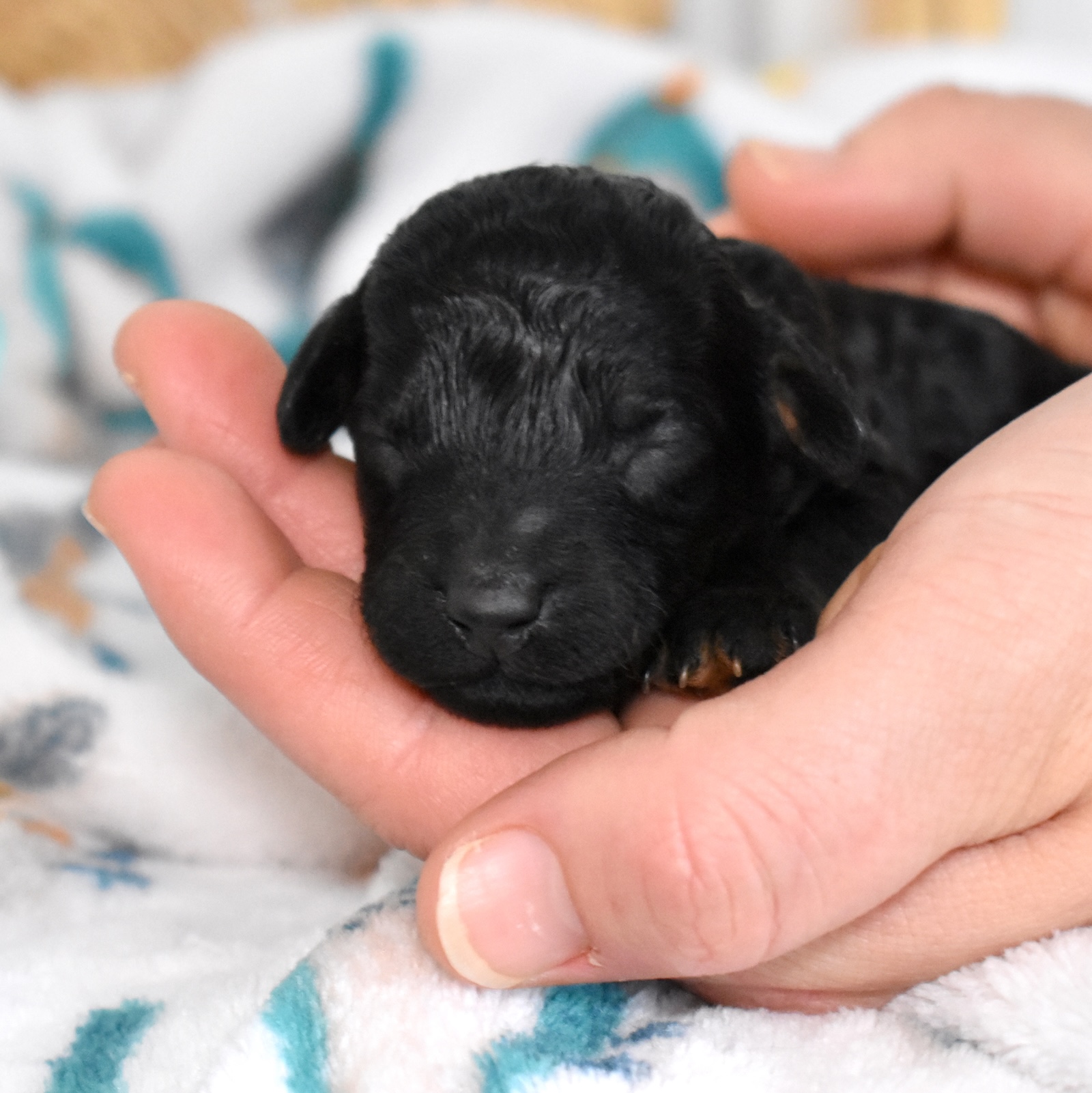 Onyx is a handsome mini poodle with a deep, jet-black coat that gives him a striking and polished look. His dark curls are soft and dense, forming that signature poodle texture that only becomes more impressive with time. With a mom at 13 pounds, Onyx is expected to stay delightfully petite — small enough for easy companionship, yet sturdy enough for playful fun.