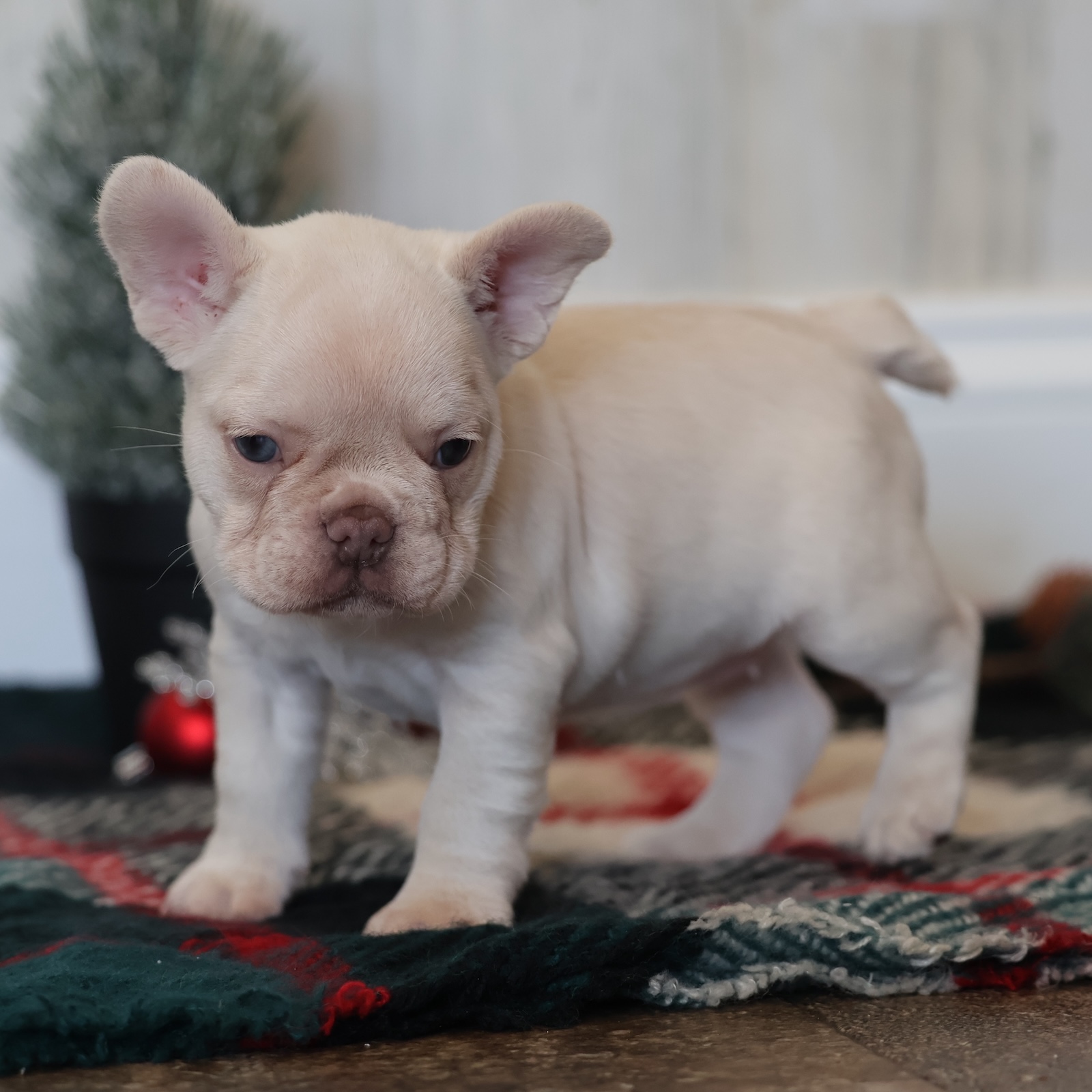Noel is a little Frenchie girl who carries the spirit of the season in everything she does. Her name means “Christmas,” and she truly feels like a gift—sweet, bright, and impossible not to fall in love with. With her expressive eyes and those classic bat ears that pop up like tiny holiday bows, Noel has a face that radiates warmth. She’s the kind of puppy who can turn a regular day into something softer and happier just by being near you.