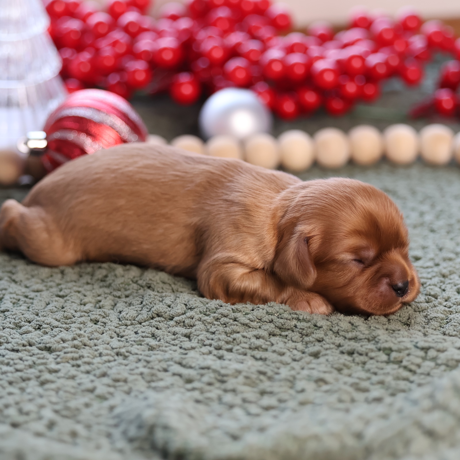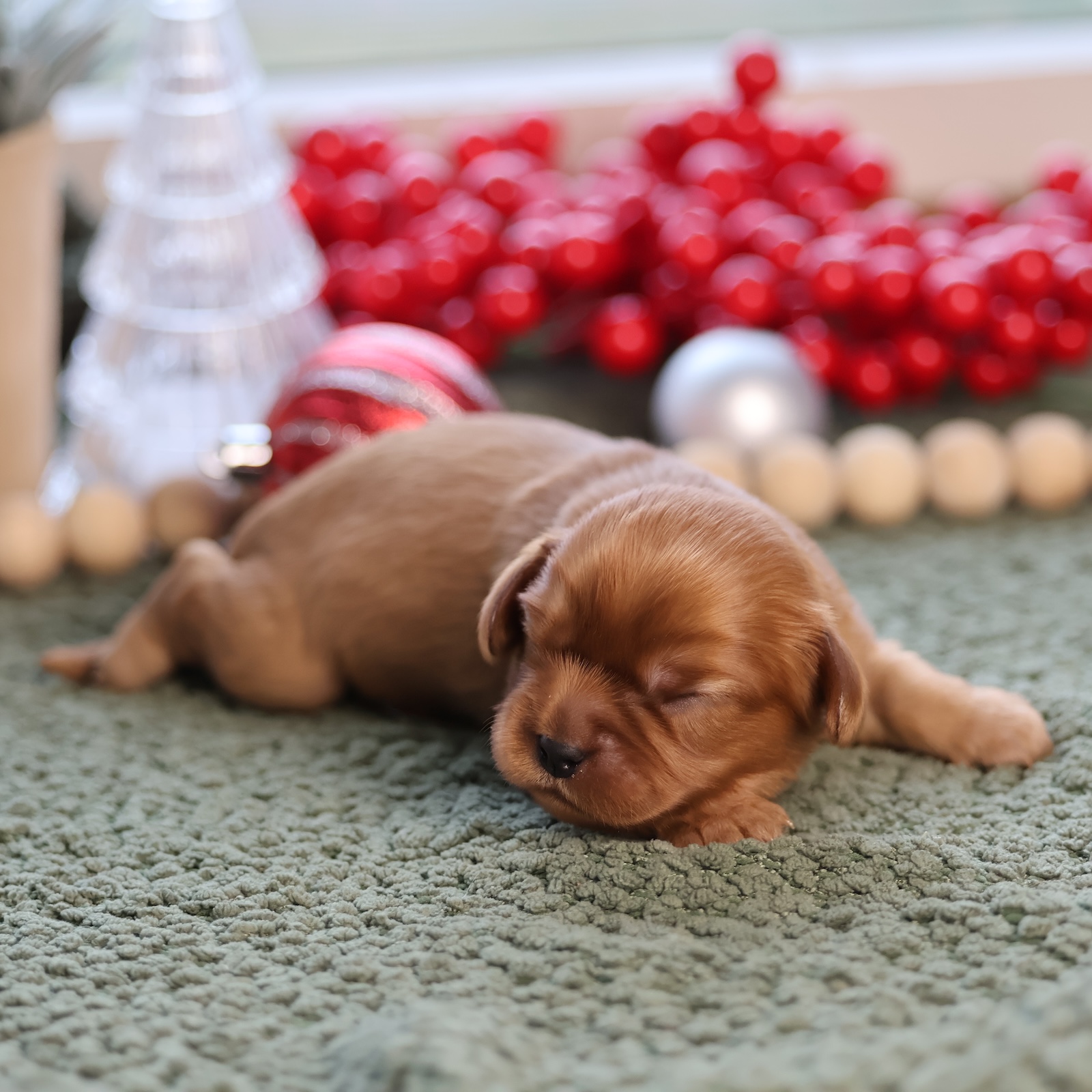 This ruby boy brings joy through his enthusiasm and warmth. Whether he’s greeting you with a wagging tail or settling in beside you for a quiet moment, Ginger has a way of making life feel fuller. Cavaliers are prized for their emotional connection to their owners, and Ginger is eager to form that deep bond that lasts a lifetime.