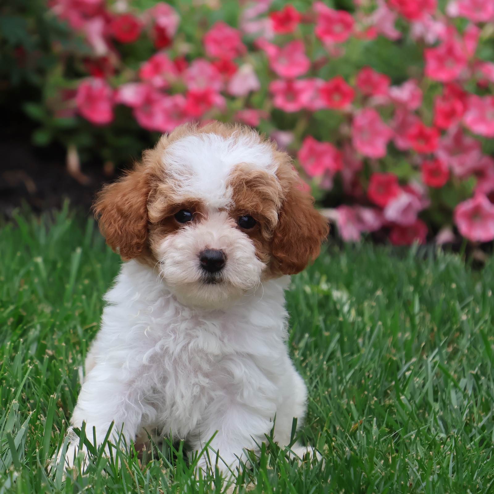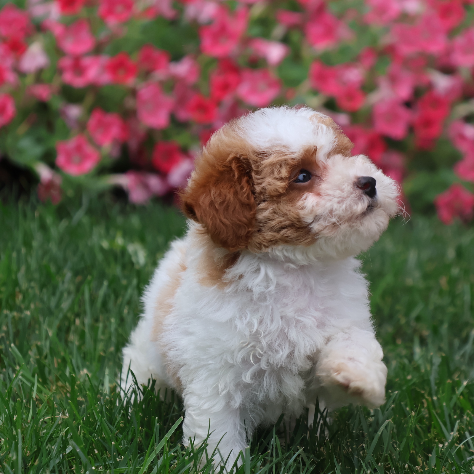 Meet our adorable female Parti Toy Poodle, a delightful bundle of charm and sweetness. With her striking coat of creamy white and warm chocolate patches, she turns heads wherever she goes—but it’s her affectionate personality that truly steals hearts. Gentle, loving, and eager to please, she thrives on cuddles and companionship. Whether curled up in your lap or prancing playfully at your feet, she brings a joyful presence to every moment. Her intelligent eyes and calm, friendly demeanor make her a perfect match for families and individuals alike. She’s not just a puppy—she’s your new best friend.