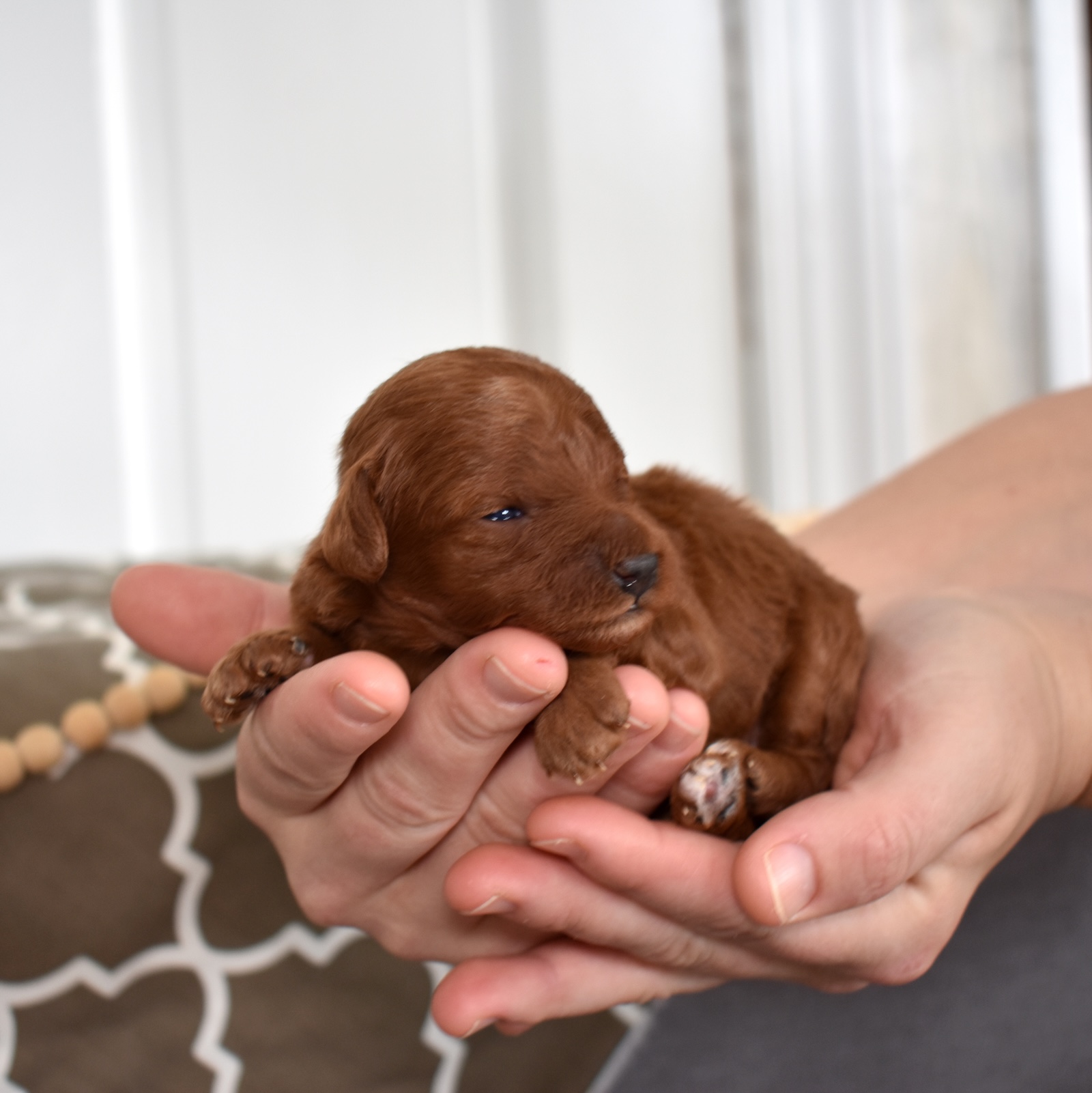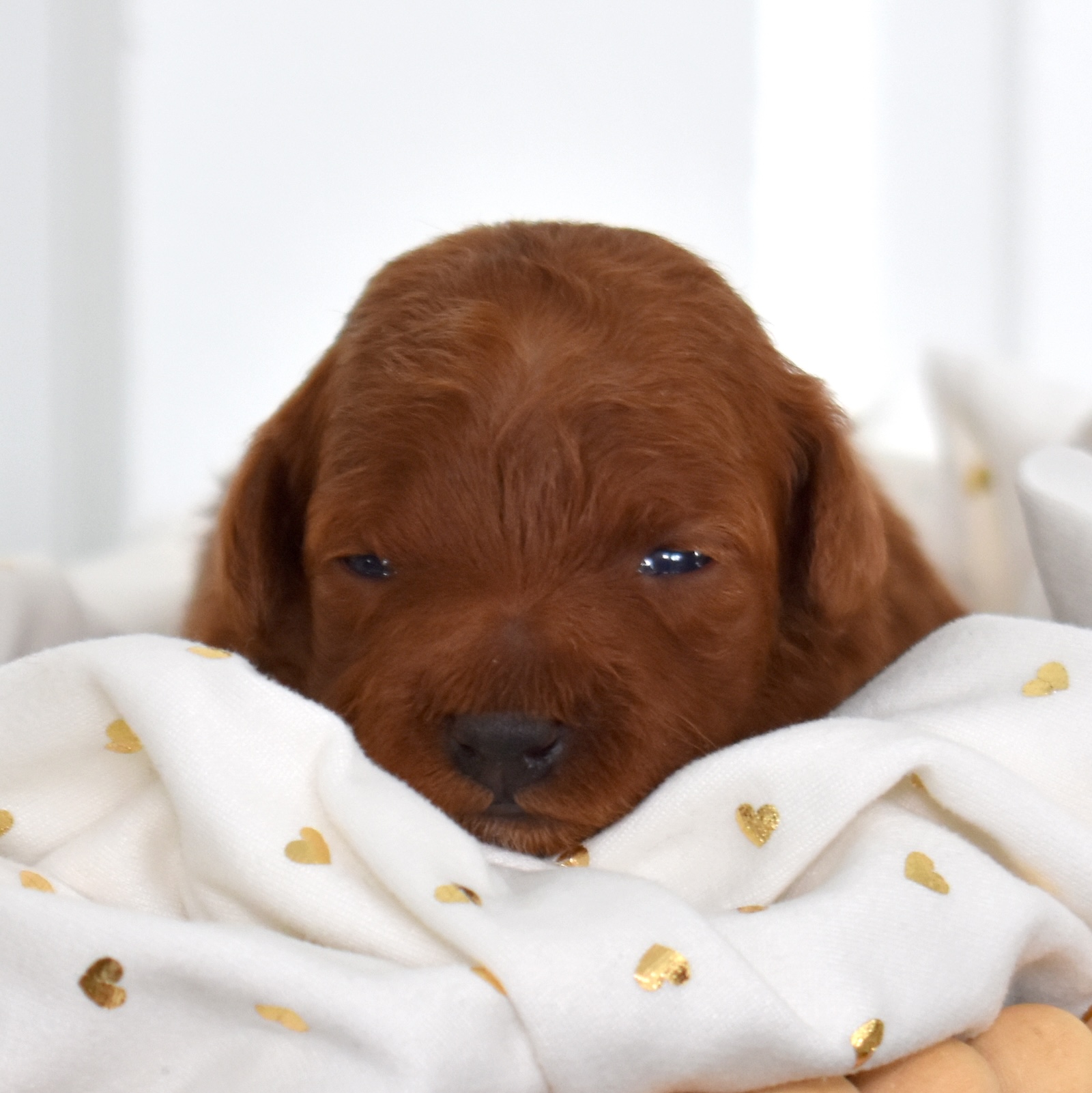 Callie is a precious red toy poodle girl with a deep, striking coat and the tiniest features that make hearts melt instantly. Though she’s only two weeks old, she’s already bringing so much joy just by snuggling close and thriving beside her littermates. Her small size, beautiful coloring, and AKC registration make her truly special.