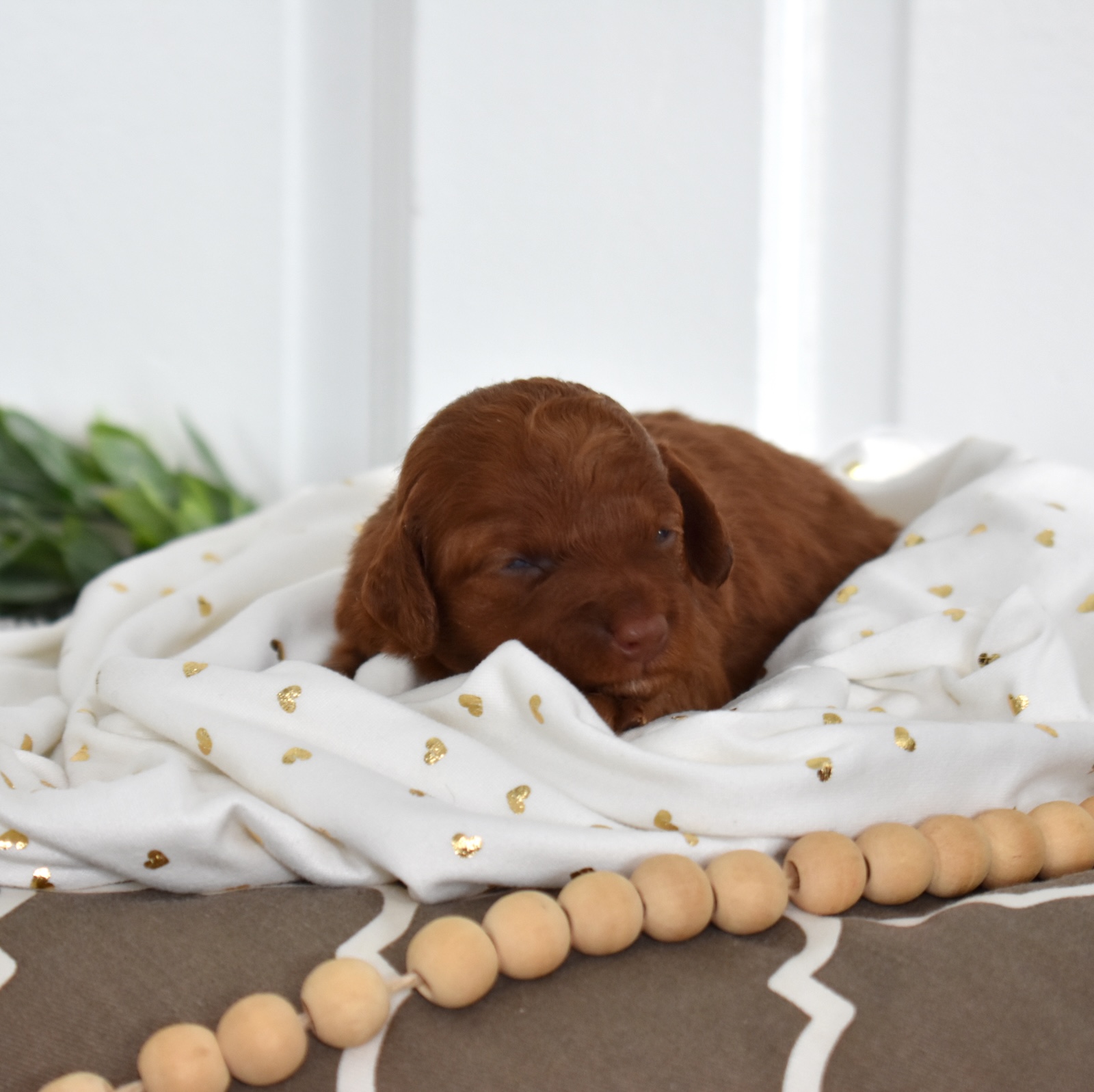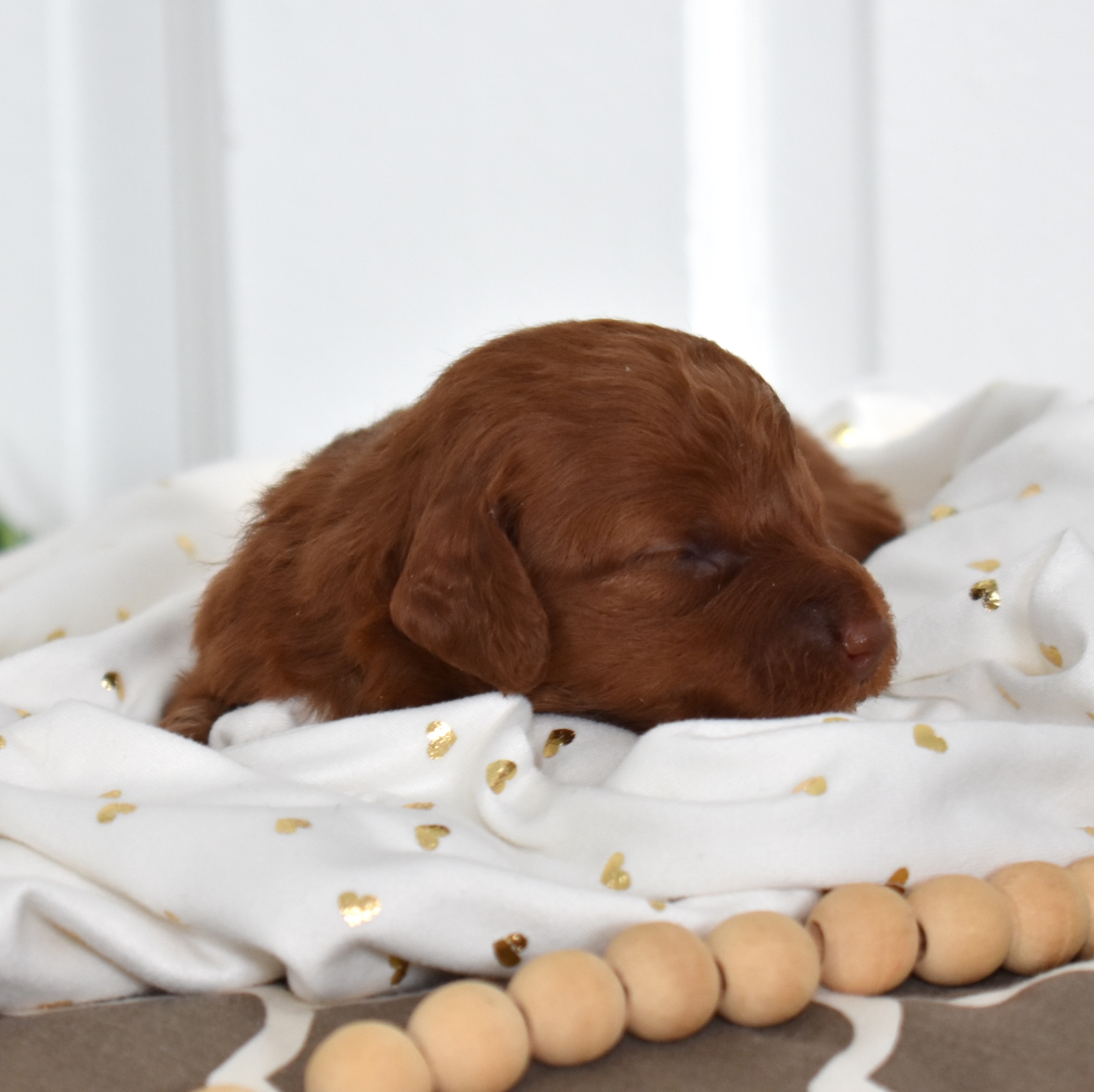 Clover is a charming red toy poodle puppy with a stunning coat and a perfectly petite build. Though he’s still very young, his gentle presence already adds so much sweetness to the litter. He is AKC registered and already easy to adore.